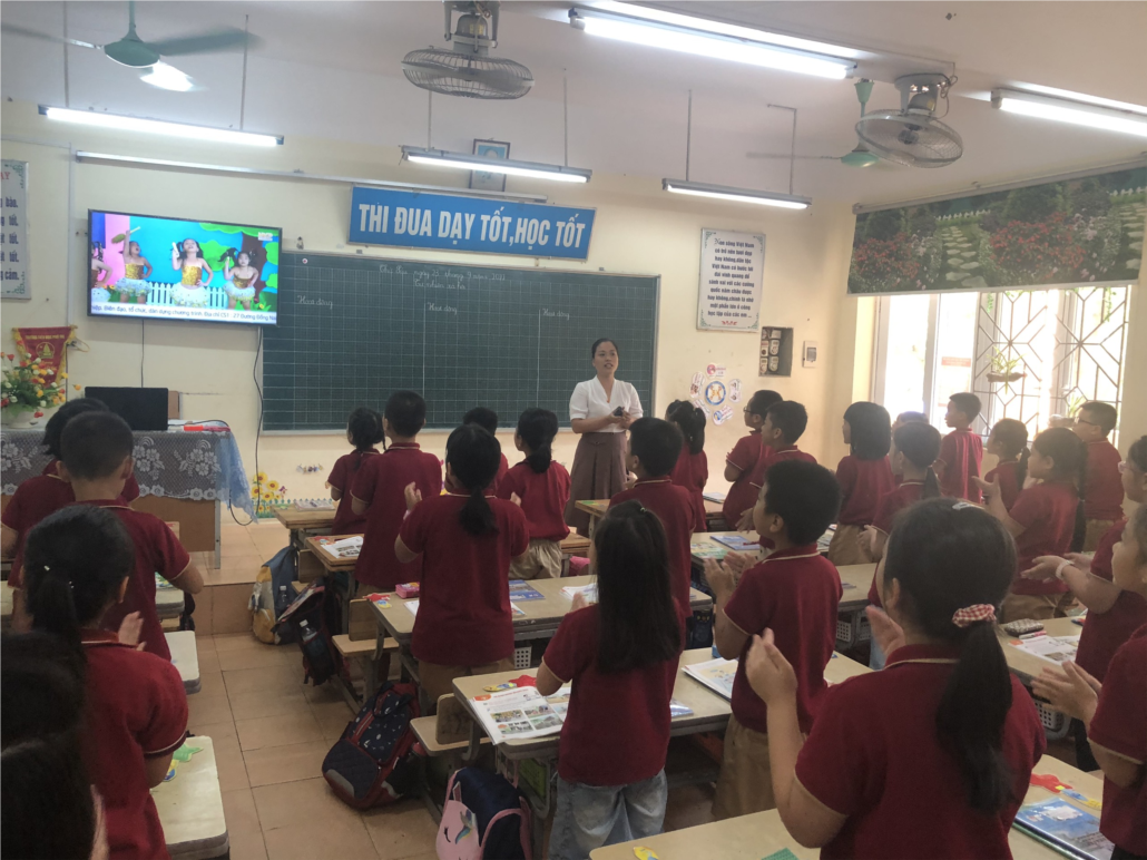 Hoạt động 2: Ích lợi của việc giữ vệ sinh xung quanh nhà. Cô giáo rất sáng tạo trong bài dạy và ứng dụng CNTT vào bài học linh hoạt bằng cách đưa nhân vật Ong Vàng đồng hành cùng HS. Cả lớp rất hào hứng và tập trung lắng nghe những câu dẫn dắt của Ong Vàng.
